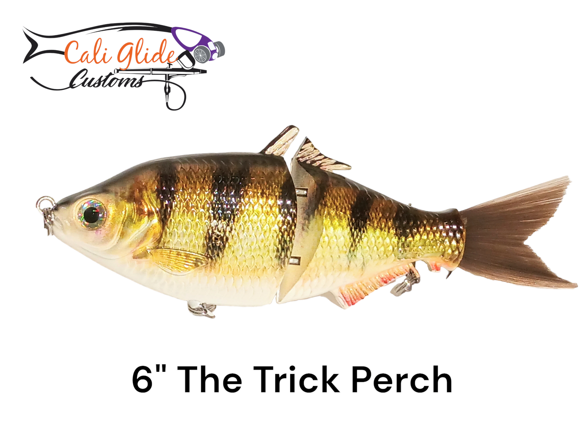 6" Inches Perch Swimbait. The Trick by Cali Glide has now set the bar, with its realistic 3D scanned paint jobs from real bait fish. Not to mention, it’s S gliding swimming action. Lures in the big ones! Fish this lure with confidence. It currently has caught largemouth bass over 10 lbs and stripers over 40 lbs. Equipped with super tough treble hooks & rattles to lure fish from far a distance. If you don’t have a Cali Glide in your tackle box then you're really missing out! Catch Bass, Trout, Pike, Striper, Muskie, etc.